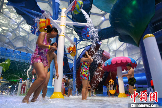 8月7日,亚洲最大的室内主题水上乐园--水立方嬉水乐园拉开了神秘面纱,迎来首批体验者。中新社发 富田 摄