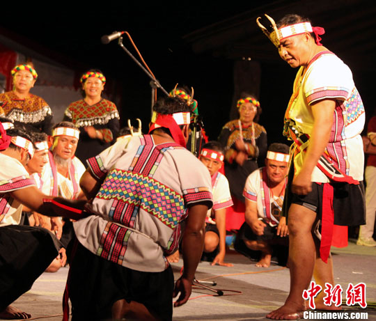 8月7日,台湾高雄县布农人在“莫拉克”灾后重建园区举办的晚会上演唱八部和音,追思一年前在风灾中遇难的乡亲。中新社发 刘舒凌 摄