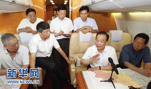 8月8日中午,中共中央政治局常委、国务院总理温家宝率国务院有关部门负责同志赶赴甘肃省舟曲县受灾地区。这是温家宝在赶赴灾区的飞机上召开会议,安排救灾事宜。李学仁摄