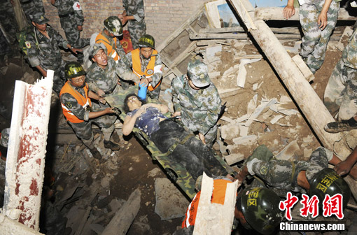 8月8日晚20时50分,一名幸存者被救援的解放军成功救出。甘肃舟曲藏族自治县泥石流地质灾害发生后,兰州军区某防化团602名官兵经过六个多小时的急行军,于8日上午11时58分到达舟曲灾区,部队到达后立即展开人员搜救,截止20时50分共救出9名幸存者。中新社发 张永进 摄