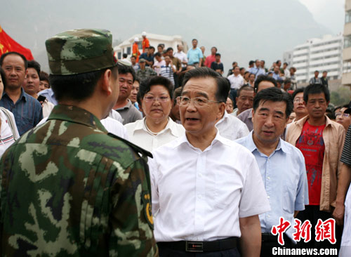 8月9日上午,中国国务院总理温家宝来到甘肃舟曲泥石流重灾区甘肃舟曲县了解灾情,看望灾民,慰问参加抗洪救灾的解放军、消防、武警官兵。图为温家宝看望慰问正在灾区现场救援的四川消防官兵。