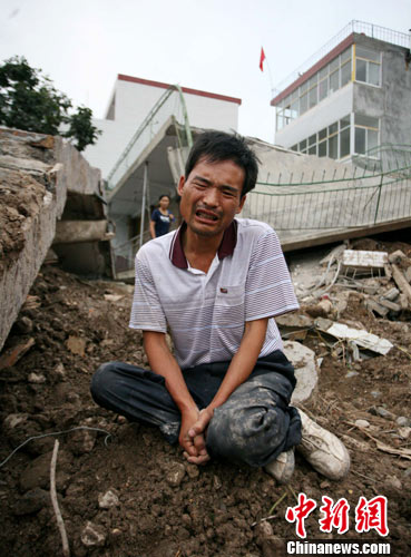 8月9日,甘肃舟曲泥石流灾区搜救进入第二天,不少当地民众自发在受灾严重的县城寻找失踪亲人。图为一位失去妻儿的男子坐在被冲毁的房前哭泣。 中新社发 刘忠俊 摄
