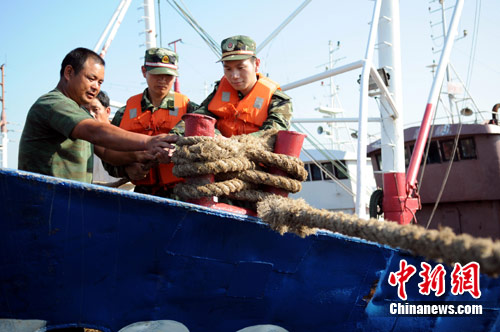8月9日,受今年第4号强热带风暴“电母”影响,浙江温州沿海海面的风力逐渐增强到7级阵风8~9级。面临可能擦肩而过的强热带风暴,温州边防支队迅速启动防台工作预案,提醒海上作业船舶及时进港避风,并积极帮助群众做好各项防御准备工作。图为8月9日,温州边防支队官兵帮助渔民加固缆绳。