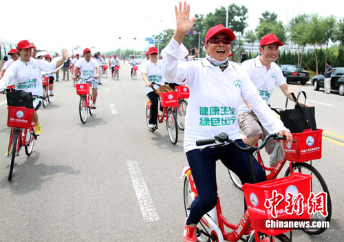 8月10日,中国人权发展基金会全国公共自行车服务系统在山东烟台启动投入试运行。作为全国首个公共自行车服务系统试运行城市,烟台首批已建成50个站点,投入3000辆自行车运行,全市预计将建300个站点,投入15000辆自行车。烟台试运行后,公共自行车服务系统将逐步向全国各大中城市推广。图为烟台市民代表兴奋体验公共自行车服务。