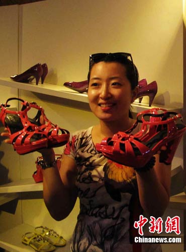 10日,台湾馆第40万名幸运参观者顾雯获得了一份“惊喜大礼”:50双样式各异,鞋码各异的某品牌女鞋。顾雯直呼:“下辈子也不愁没鞋啦”。陈婷婷 摄