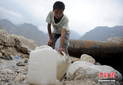 8月10日,甘肃舟曲泥石流灾区,灾区居民到翠峰山前的泉水口接水饮用。中新社发 廖攀 摄