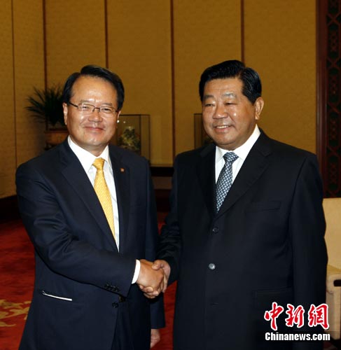八月十一日,全国政协主席贾庆林在北京人民大会堂会见以郑义和为团长的韩国超党派议员代表团一行。