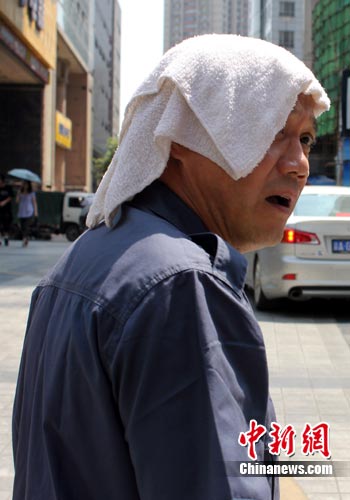 夏日炎炎,整个山城仿佛被置于烧烤架上。8月11日,重庆市气象局继10日后连续发布“高温红色预警”信号,称该市27个区县日最高气温将飙升至40℃以上。图为一名当地市民用湿毛巾搭在头上降温。