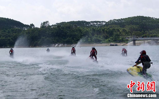 8月11日,来自海峡两岸的12名身怀绝技的水上摩托车、摩托艇运动员,在广西北海市星岛湖景区表演水上摩托车分列式、障碍赛、花式表演等精彩项目。作为此间正在举行的“第二届广西体育节”重要活动内容之一,当天的赛事吸引海峡两岸众多水上摩托车、摩托艇运动爱好者前往观战。