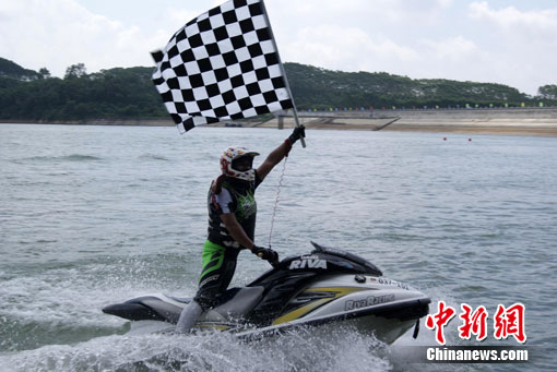 8月11日,来自海峡两岸的12名身怀绝技的水上摩托车、摩托艇运动员,在广西北海市星岛湖景区表演水上摩托车分列式、障碍赛、花式表演等精彩项目。 中新社发 翟李强 摄