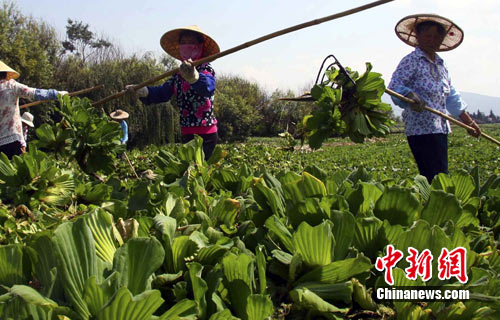 8月,昆明大观河入滇河道口有大量水葫芦漂浮聚集,阻塞河道,使来往船只划行困难,还污染了水质。云南滇池是最早被水葫芦入侵的湖泊之一。图为村民在大观河上打捞水葫芦。图为大面积水葫芦使船只行驶困难。