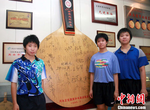 8月12日,首届“冀台青少年乒乓球暑期训练营”在河北正定国家乒乓球训练基地开营。这是大陆首次以官方名义组织两岸青少年交流乒乓球技艺,参加的台湾青少年都是第一次来大陆,终于见到了中国国家乒乓球基地著名的“大球拍”和乒乓名将的亲笔签名。图为台湾小球员争相与“大球拍”合影。