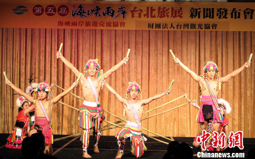 第五届海峡两岸台北旅展将于13至16日举行,本届两岸旅展是首度独立展出,在面积、人数、参展商、展出产品等方面创下多项新纪录。图为台湾舞团在展前新闻发布会上表演阿美族舞蹈。中新社发 路梅 摄