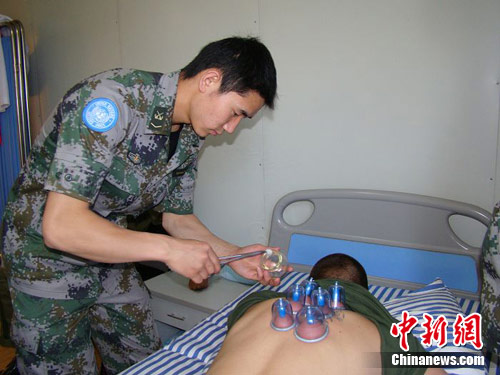西班牙军人接受中医拔罐治疗。 杨欢欢 摄
