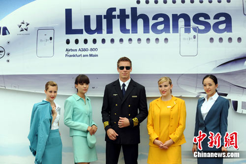 8月13日,德国汉莎航空公司在北京开展一系列前所未有的A380飞行模拟器巡演活动,邀请市民踊跃前往、亲自体验A380客机的尖端科技。德国汉莎航空成为首家启用A380客机的欧洲航空公司,汉莎航空A380客机由法兰克福至北京的首航航班将于9月2日抵达北京首都机场。图为汉莎航空公司空乘人员身着不同时期空乘制服展示。