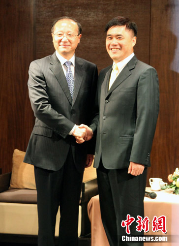 8月13日,率团出席第五届海峡两岸台北旅展的海峡两岸旅游交流协会会长邵琪伟与台北市市长郝龙斌会面。邵琪伟赞扬台北是一个充满活力、友善、便捷的宜居城市,并表示将鼓励、推动大陆游客参观年底举行的台北花卉博览会。中新社发 刘舒凌 摄