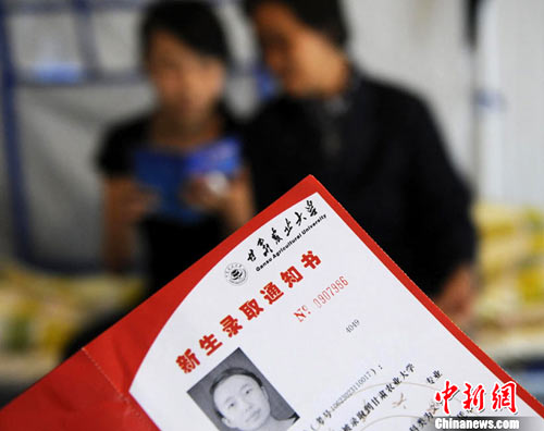 8月14日,甘肃舟曲灾区的高考录取通知书正在发放过程中,学生们接过火红色的录取通知书信封,眼里有藏不住的笑意。然而,有一些通知书却永远无法发出了。截至上午10点30分,舟曲一中收发室当天共发出7份录取通知书,还有30多封正等待领取。中新社发 廖攀 摄