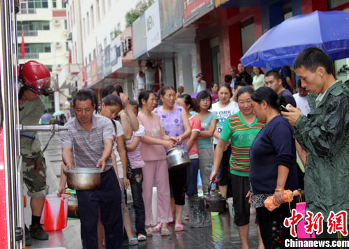 8月14日,四川九寨沟县遭遇特大暴雨泥石流侵袭,九寨沟县城生活水源受污染造成全城停水,城区两万多群众生产生活用水告急。九寨沟县自来水公司表示,停水将持续数日,恢复供水时间还不能确定。图为九寨沟县城居民正在打水应急。