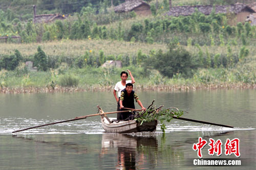 8月14日,流经吉林省临江市的鸭绿江水位持续回落,与临江市隔江相望的朝鲜中江郡两名农民乘小木舟打捞江面上漂浮的树木枝叶。中新社发 任晨鸣 摄