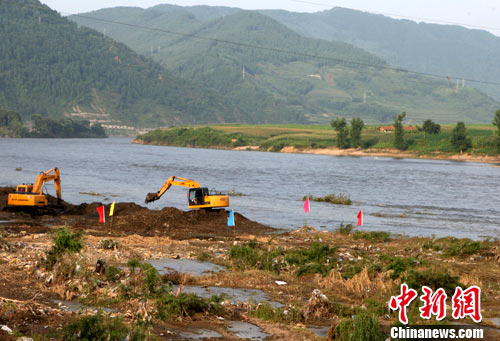 8月14日,流经吉林省临江市的鸭绿江水位持续回落,与朝鲜中江郡隔江相望的吉林省临江市开始全面清理洪水过后鸭绿江岸边的泥石与杂物。临江市是吉林省今夏罕见洪灾受灾最严重的地区。中新社发 任晨鸣 摄