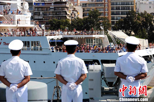 近日,由中国海军第五批护航编队“广州”舰、“巢湖”舰组成的舰艇出访编队,圆满结束对希腊共和国的友好访问,驶离比雷埃夫斯港。希腊海军官兵代表、中国驻希腊使馆、中资机构、华人华侨代表等,到码头为护航官兵送行。图为舰艇离开希腊。