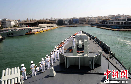 近日,由中国海军第五批护航编队“广州”舰、“巢湖”舰组成的舰艇出访编队,圆满结束对希腊共和国的友好访问,驶离比雷埃夫斯港。中新社发 江山 摄