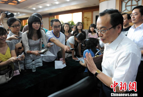 8月15日,卫生部就“圣元乳粉疑致儿童性早熟”调查结果举行专题发布会,北京协和医院内分泌垂体性腺学组组长伍学焱教授指出,对湖北报道的三例婴幼儿,经过反复研究她们的病史、临床表现、化验检查以及影像学的检查,在他们看来,都属于正常的微小青春期范围。图为新闻发布会结束后,记者追问伍学焱。