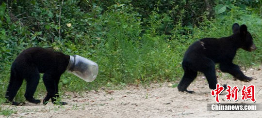 图:黑熊头部被塑料罐套住10天未进食——中新网