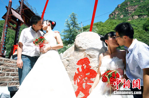8月16日,中国情人节七夕,“第六届中国·邢台天河山七夕爱情文化节”在牛郎织女故事的原生地——“中国爱情山”隆重举行,来自该省的百余新人在这里举行了集体婚礼。图为新人们在“爱情石”前相拥热吻。