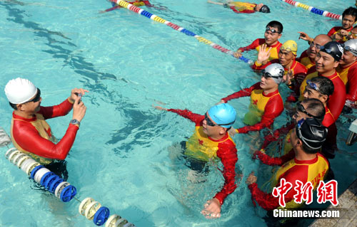 8月16日,一名台湾红十字组织的水上安全救生高级教练在泳池边为学员们拍照,气氛甚欢。当日,2010福建省红十字水上安全救生教练训练班在福州开班,来自福建省红十字水上安全志愿服务队和福建省九地市经严格选拔的30名学员集中参加为期一周的训练,6名来自台湾红十字组织的水上安全救生高级教练全程担任培训指导教练,讲授水上救生救护理论知识,示范各种国际最新的救生救护技巧。