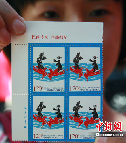 8月16日,中国传统节日七夕,《牛郎织女》纪念邮票全国首发仪式在牛郎织女故事原生地——“中国爱情山”河北邢台天河山举行。图为牛郎织女鹊桥相会珍邮。