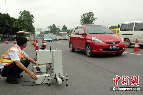 8月16日,环保工作人员在广州白云大道设置机动车排气移动监测装置,检测过往机动车的尾气排放情况。目前,广州正集中力量进行亚运空气质量保障工作,以确保实现“绿色亚运”目标,并让市民在亚运后继续享有更加优良的环境空气质量。