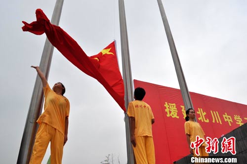 8月17日,由海内外侨胞和港澳同胞共同捐资修建的北川中学正式竣工。占地225亩,总投资2亿元的北川中学位于北川县永昌镇,可供5200名学生学习和寄宿,按抗震烈度八度设计,耗时一年修建。图为北川中学学生正在举行升旗仪式。
