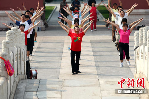 8月17日,北京市职工工间操健身项目教练员培训班在劳动人民文化宫开班,首批17个单位的80多位教练员正在接受第八套广播体操培训。中新社发 富田 摄