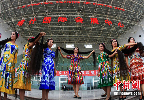8月17日,在新疆喀什举行的国际旅游文化节上,28名维吾尔族妇女上演一场“长发秀”,展示她们瀑布般的长发。中新社发 刘新 摄