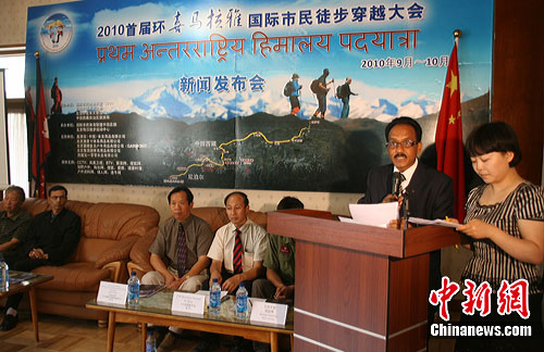 8月17日,尼泊尔驻华大使坦卡·普拉萨德·卡尔基在“首届环喜马拉雅国际市民徒步穿越大会”新闻发布会上讲话。该徒步大会将于9月25日自拉萨布达拉宫启程,途经羊卓雍湖、冈巴拉雪山、珠峰北坡大本营等地。在跨越中尼边境樟木口岸时,尼泊尔驻华大使坦卡·普拉萨德·卡尔基将亲自带领队员携手穿越中尼边境。今年是中尼建交55周年,这次徒步大会将再一次建立“民间徒步外交”道路上的新起点。中新社发 苏丹 摄