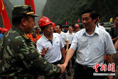 8月17日下午,中共四川省委书记刘奇葆来到绵竹清平泥石流灾害现场,查看道路抢通情况,并慰问抢险人员。中新社发 王超 摄