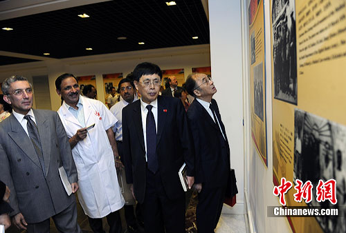 8月17日,由中国人民对外友好协会与中国印度友好协会联合主办的柯棣华诞辰100周年生平图片展在京举行。中国印度友协会长、前全国人大副委员长蒋正华,全国友协会长陈昊苏,印度驻华使馆公使拉胡尔·查布拉等出席。图为中国友协会长陈昊苏(右二)与印度驻华使馆公使拉胡尔·查布拉(左一)参观展览。中新社发 刘震 摄