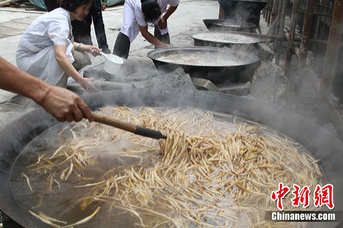 8月17日,甘肃舟曲县人民医院旁,医务人员熬制中药汤剂。甘肃省卫生厅官员表示,大蒜、花椒、黄花菜等食疗中药在舟曲灾区卫生防疫中起了重要作用。舟曲县城内设置了六处熬制中药汤剂的发送点,免费向受灾民众和救援人员发送。中新社记者 殷春永 摄