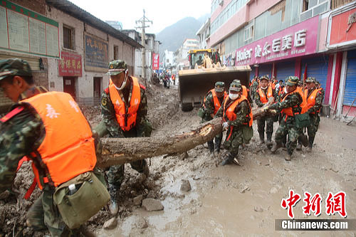 8月17日,武警甘肃森林总队和武警水电部队一起展开清淤救援行动,水电部队利用挖掘机和铲车等大型机械不停地进行清淤作业,江边和县城主要街道由森林官兵实施人工清淤。他们利用铁锹、镐头和推车等工具,将泥沙和淤泥进行全面清理,并将部分泥泞的街道铺上石子。庞红升 摄