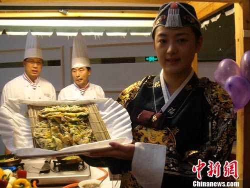 8月17日,来自韩国首尔一家大饭店的客服经理金佳蓉向大家展示大厨刚刚煎好的海鲜饼。8月17日至31日,韩国美食节走进桂林五星级喜来登饭店,来自韩国首尔的两位大厨在现场烹饪海鲜饼,中外游客和市民在这里一饱口福,品尝到炖排骨、烤肉、鲍鱼粥等正宗的韩国美食。