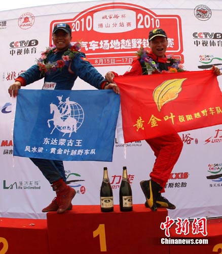 本年度全国汽车场地越野锦标赛8月17日在山东淄博落幕,来自全国20多支俱乐部车队的100多名车手参加本站比赛。风水梁极限越野车队的黄凤革(右)夺得汽油组亚军与夺得季军的黄金叶极限越野车队的高健雄喜出望外。