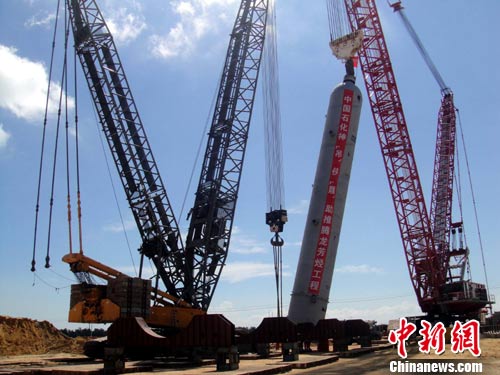 以建设石化基地为目标的福建漳州古雷半岛开发,现正在加速推进,以确保明年底PX、PTA项目按期投产及1500万吨炼化一体化项目如期开工建设。图为古雷PX项目一批核心大型重件设备陆续运抵施工现场,开始吊装,标志着该项目进入了主设备安装阶段和漳州有史以来最大的工业投资项目迈入新起点。