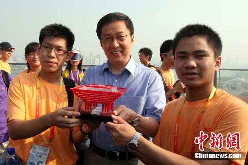 8月18日,港澳学生上海世博会参访团来到浦东世博园区参观。在中国馆60米观景平台,上海市市长韩正亲切接见了港澳学生代表,并向他们赠送了中国馆模型。图为韩正与香港学生代表合影留念。