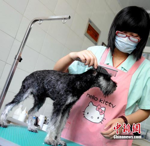 8月18日,一只宠物犬在福州宠物医院装有冷气的美容室内享受洗澡、梳、剪等服务。盛夏,福州持续高温,宠物美容业也随之生意红火。