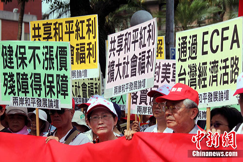 8月18日,由19个民间团体组成的“两岸和平发展论坛”发起请愿活动,支持两岸经济合作框架协议(ECFA)打开台湾经济活路,并要求执政当局停止对美军购,以推行民生福利政策,深化两岸政治互信。图为两岸和平发展论坛召集人、劳动党主席吴荣元(右一)和中国统一联盟主席纪欣(右二)站在请愿民众当中。中新社记者 刘舒凌 摄