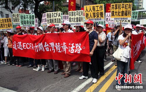 8月18日,由19个民间团体组成的“两岸和平发展论坛”发起请愿活动,支持ECFA打开台湾经济活路,并要求执政当局停止对美军购,以推行民生福利政策,深化两岸政治互信。中新社记者 刘舒凌 摄