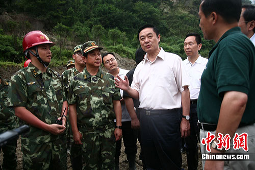 8月18日下午,刘奇葆(右2)第四次抵达映秀镇指挥堰塞体处置工作。汶川县境内因近日强降雨而引发的泥石流阻断道路、冲毁房屋,泥石流冲出物致使岷江河道淤塞,威胁灾后重建的映秀新城。中新社发 张浪 摄