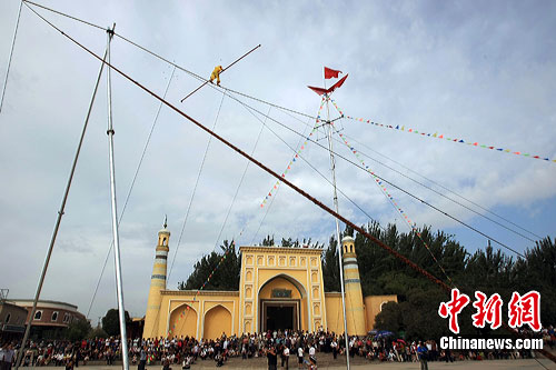 8月18日,中国最大的清真寺——位于新疆南部重镇喀什市的艾提尕尔清真寺门前,上演了一场维吾尔族古传统高空杂技“达瓦孜”表演,十几岁的维吾尔少年手持一根长竿,稳步走上八九层楼高的绳索。惊险的表演令在场的民众都为他捏了一把汗。中新社记者 刘新 摄