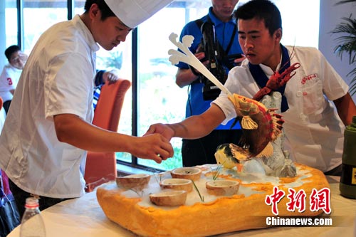 8月19日,几十位名厨汇聚在吴江太湖之滨,参加“七都杯”江浙沪塘鳢鱼烹饪技能大赛。桂花塘鳢鱼、松鼠塘鳢鱼、椰香塘鳢鱼等一道道精美的菜点,让观众啧啧称赞。据悉,上海世博会开幕式上招待数百位中外贵宾的“世博第一宴”,第一道热菜就是“荠菜塘鳢鱼”。塘鳢鱼外形似鲈鱼,但体形较小,一般只有20厘米左右,肉质洁白细嫩、味道鲜美,以苏州最为盛产。图为两位厨师在完善菜品“椰香塘鳢鱼”。